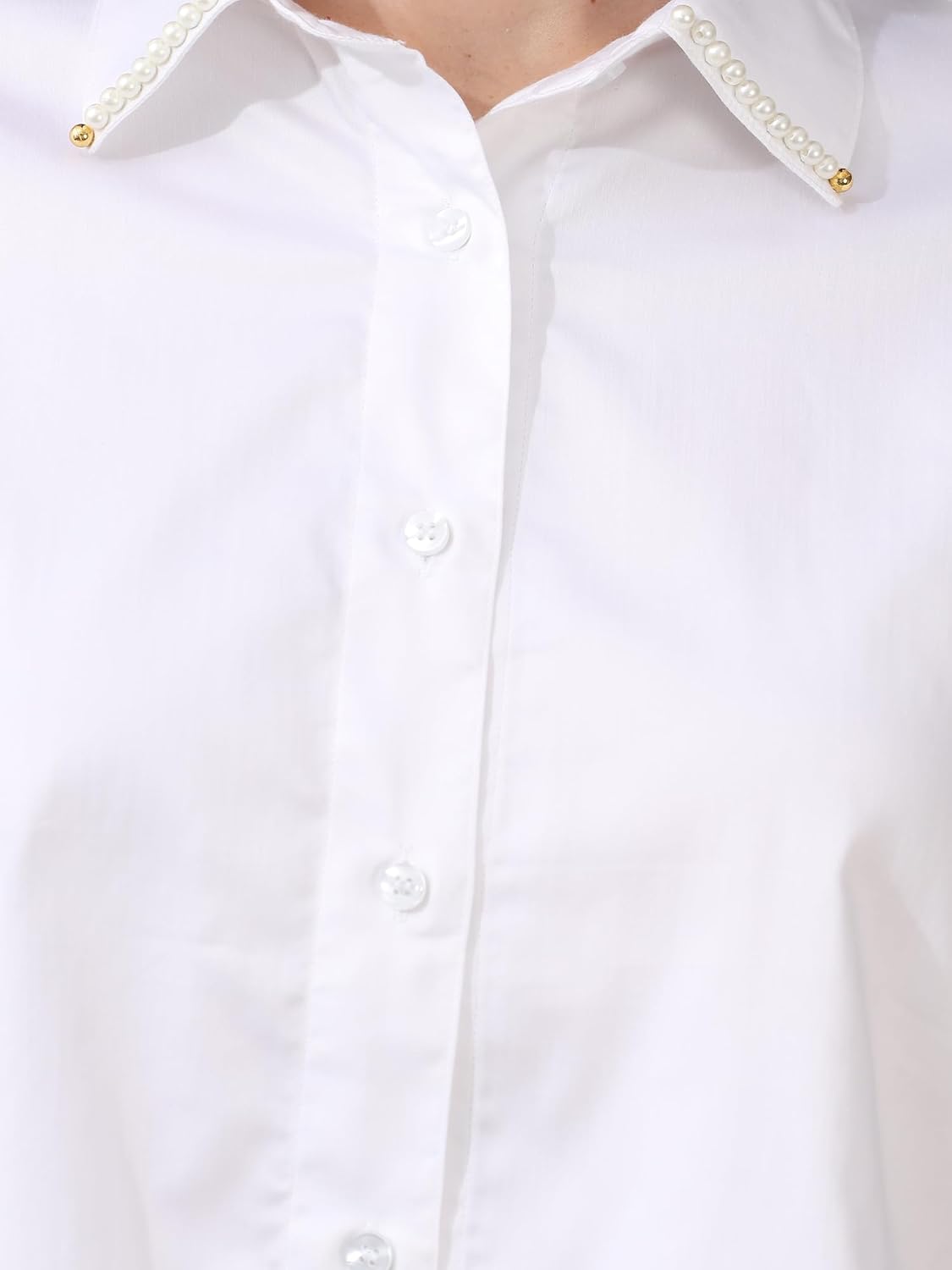 ELEGANT DESIGN: This white crop shirt boasts a chic pearl-embellished collar and modern drop shoulder design, creating a fashion-forward look.