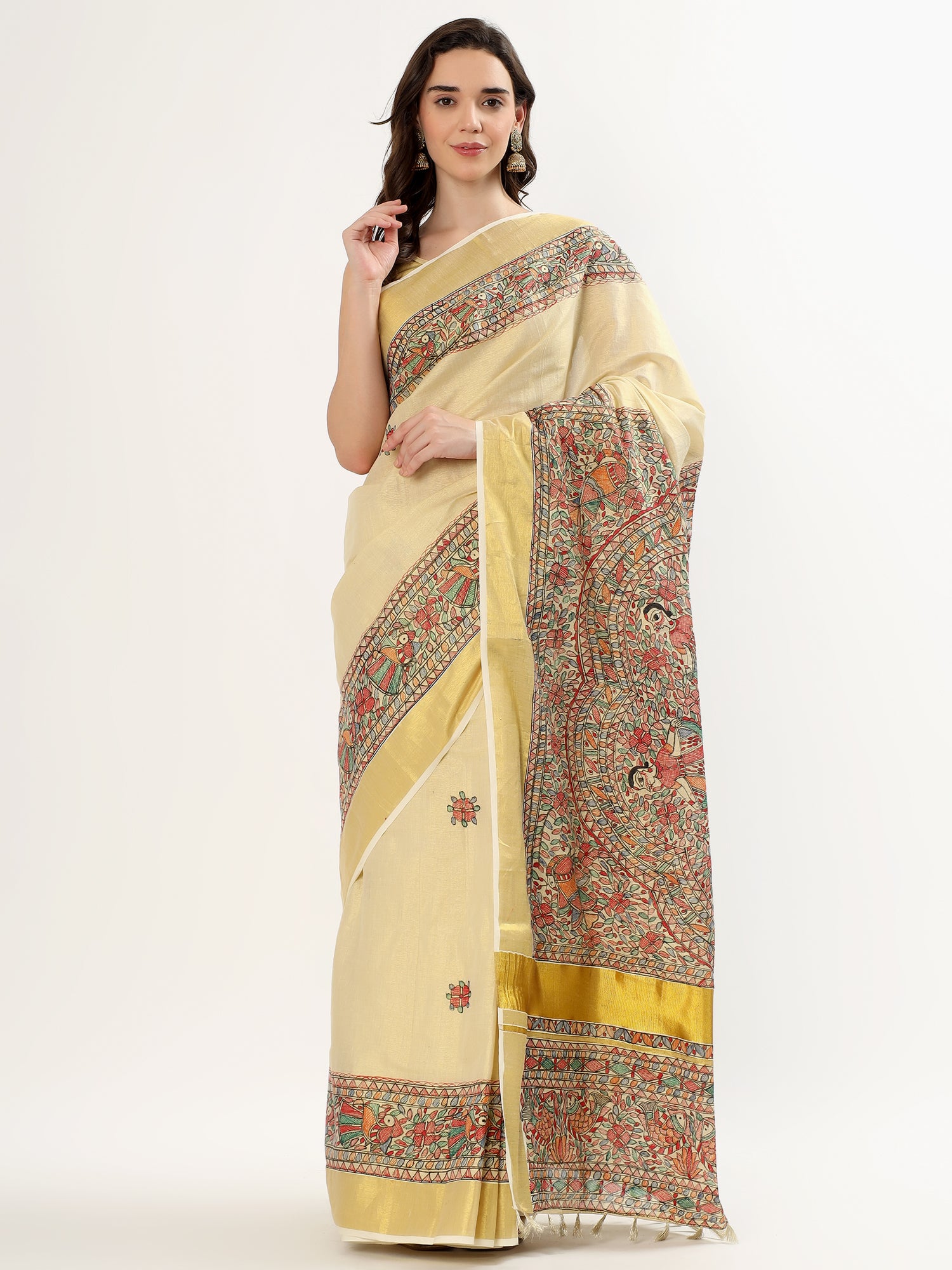 Handmade Cream Saree with Madhubani Art & Golden Border – Artisan Heritage Elegance (MADHUBANI PAINTING)