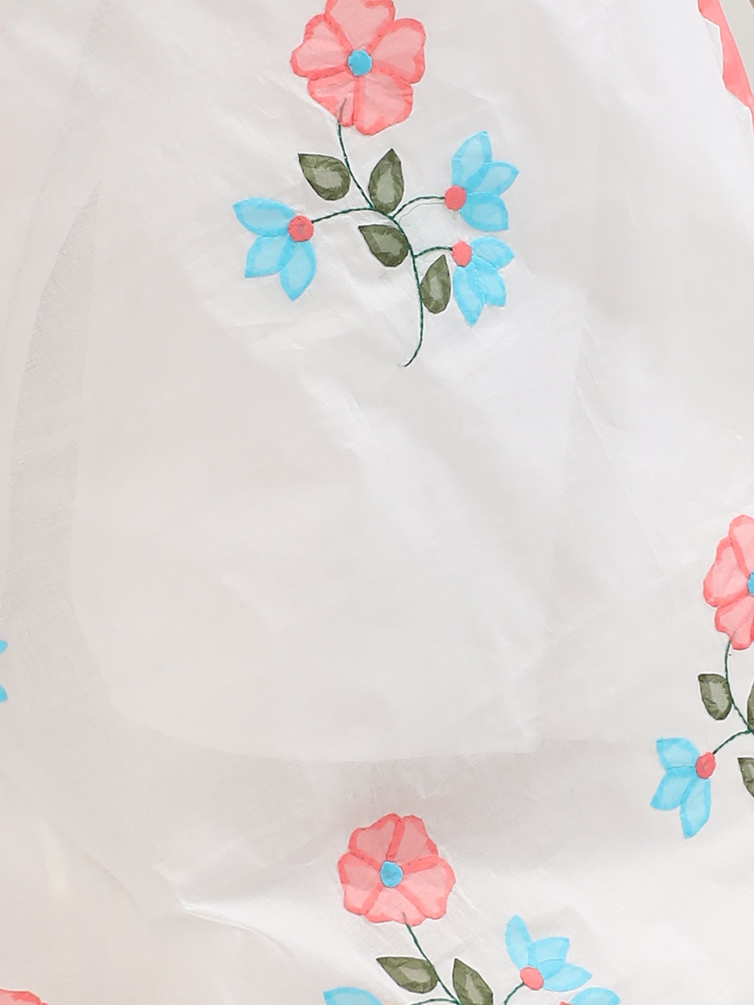 Add elegance to your ethnic wardrobe with this handcrafted cotton dupatta, measuring 2.5 meters for versatile styling. Designed using traditional applique patchwork techniques, it features colorful floral embroidery with pink and blue flowers and green leaves. The pink zigzag border enhances the charm, blending heritage craftsmanship with modern appeal. Lightweight and breathable, this dupatta pairs beautifully with kurtis, suits, or lehengas, making it perfect for festive wear, weddings, and cultural gatherings.